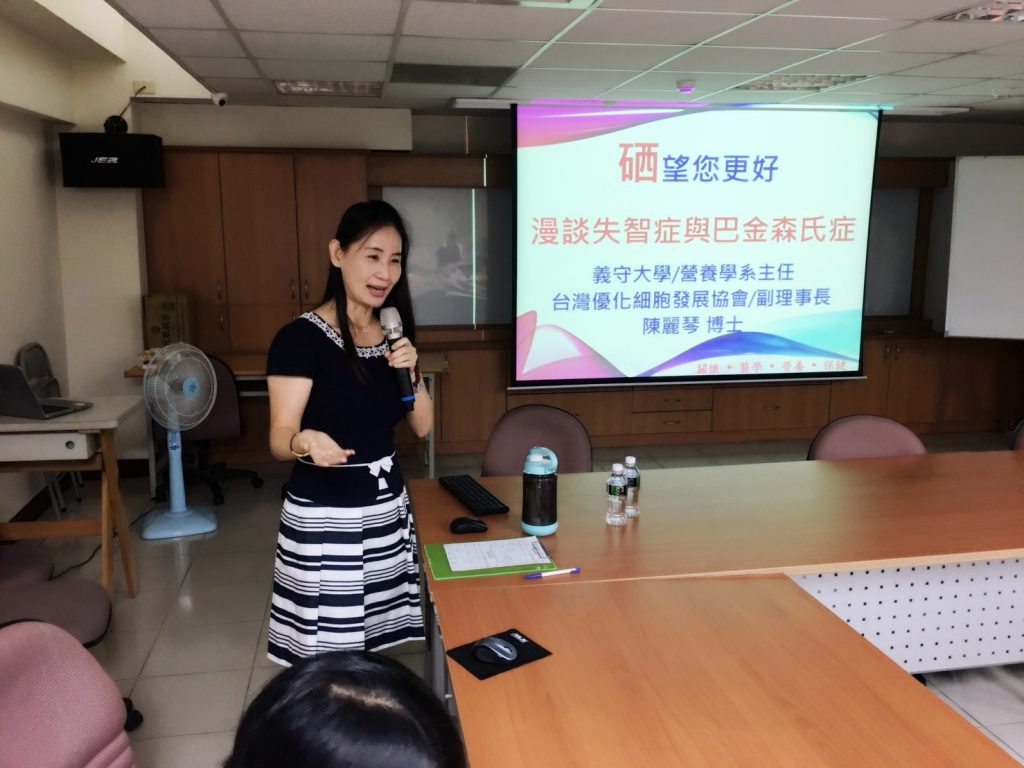 本公司執行顧問陳麗琴教授,受邀至高雄市長照2.0社區整體照顧服務體系,針對護理師群,以「硒望您更好~漫談失智症與帕金森氏症~」。以國際學術期刊研究論述,就硒元素改善失智症、阿茲海默症、帕金森氏症案例作用機轉、及運用,一一詳述,深獲與會護理師及病患家屬的熱烈迴響。